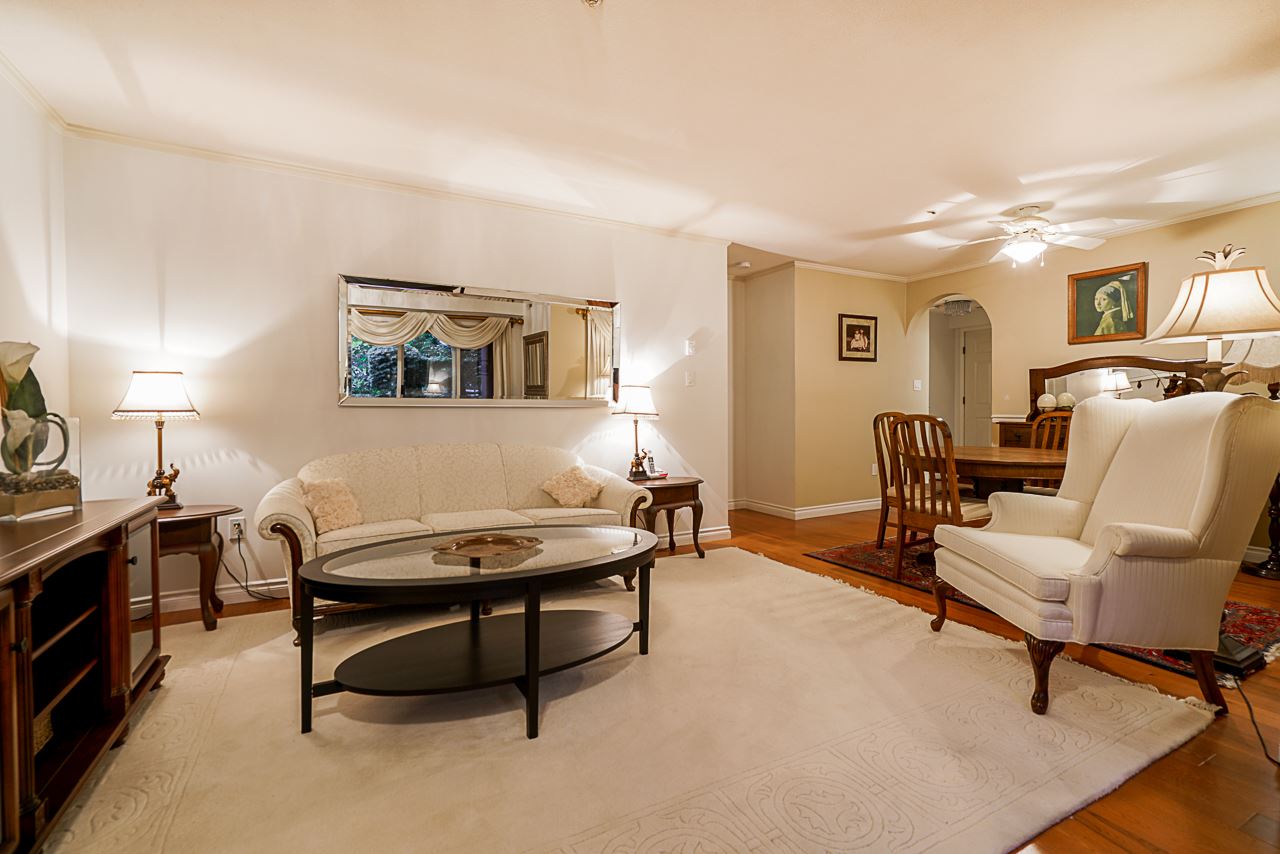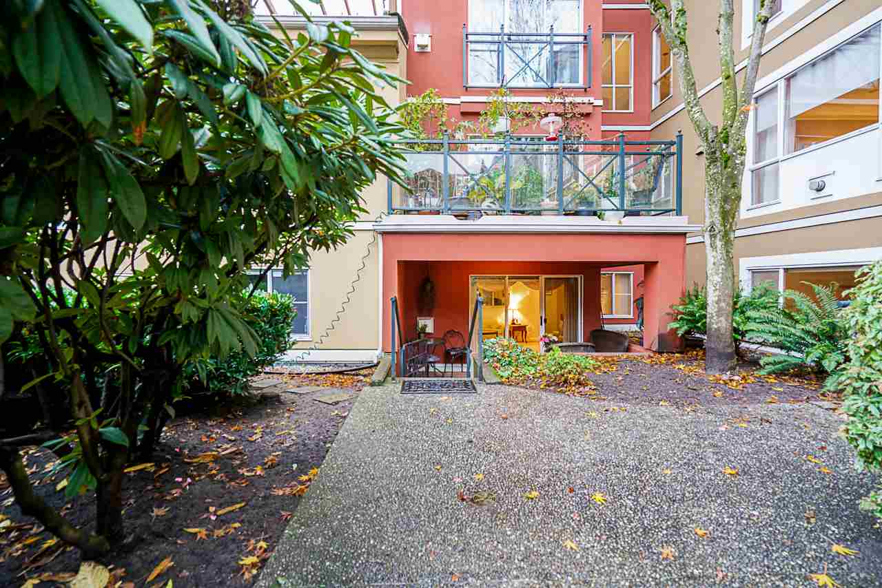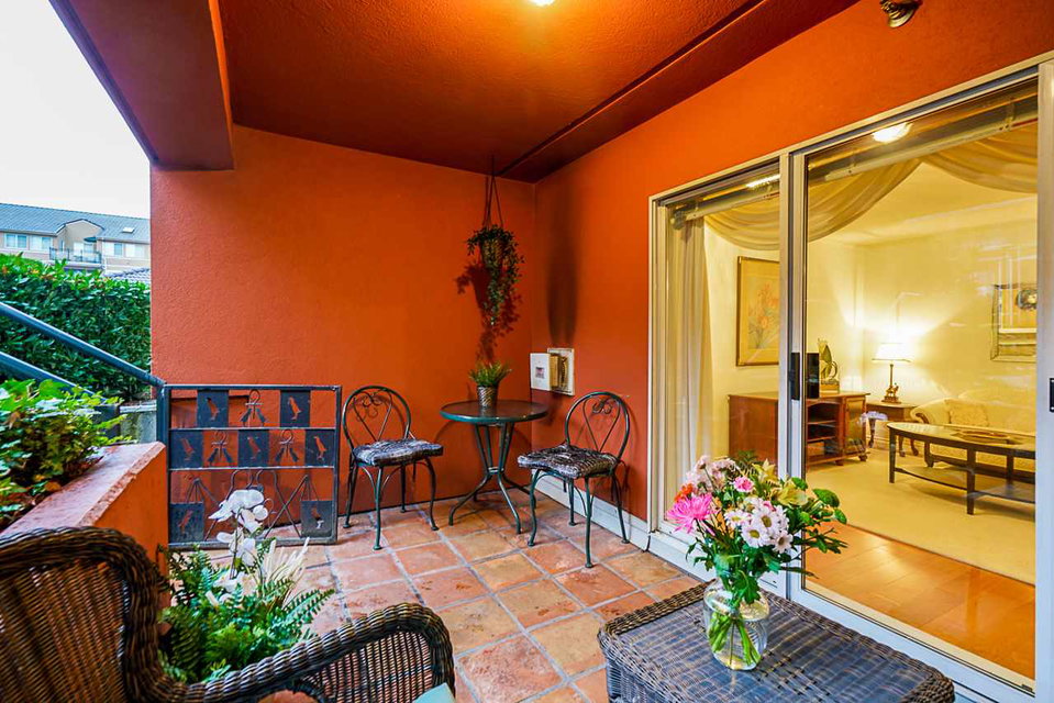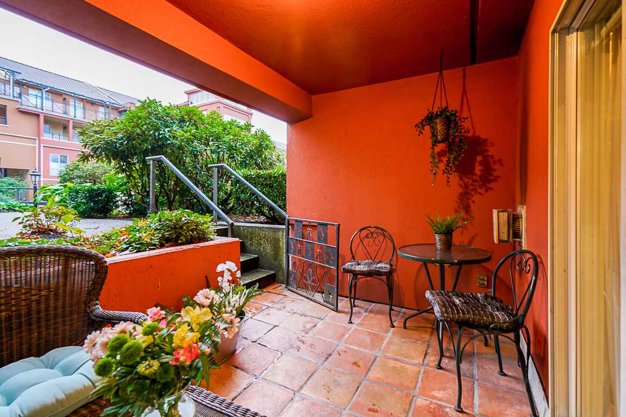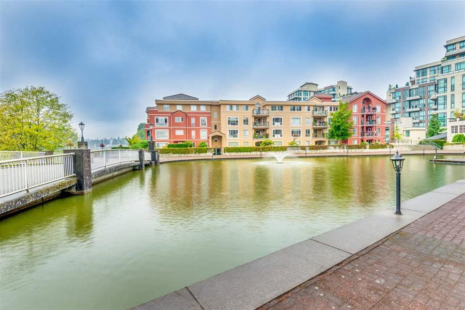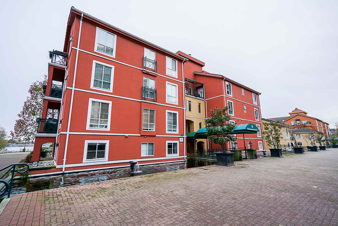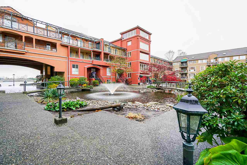 Elegant 2 bedroom, 2 bathroom, renovated corner suite on ground level with complete privacy & original owner. Bonus is exterior townhouse entry right beside elevator to parking. Enter into foyer w/newer bright kitchen w/granite countertops, glass backsplash, undermount lighting & eating area. Open style floorpan w/formal diningrm & spacious living room w/gas f/p & sliders out to large & private South garden patio w/gate to Riverfront & amazing views to infinity lagoon out to Fraser River. Upgraded H/W floors, crown moldings, 1 yr washer/dryer & new lighting thru out. Spacious masterbdrm w/walk thru closet to 4pce ensuite. Separate 2nd bedrm w/ 3pce updated bathrm. 1 parking, locker, pets ok. Rialto rainscreened building, exterior painted & repiped. Central location in The Quay. SEE VIDEO !