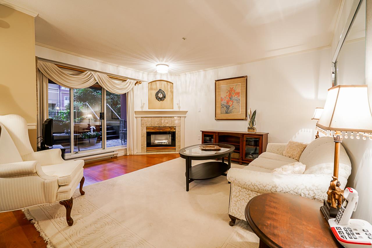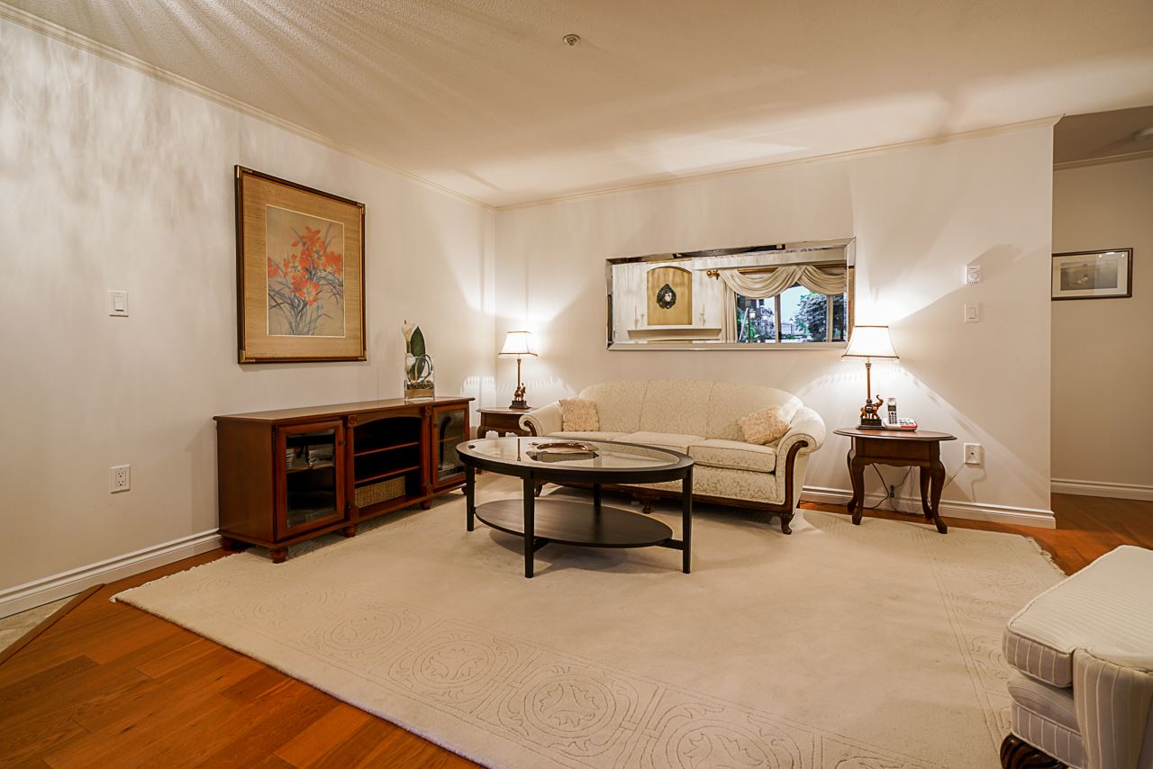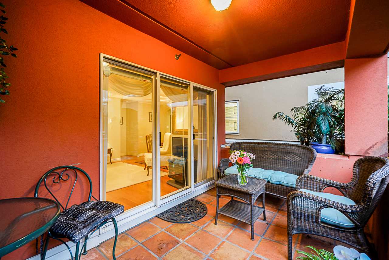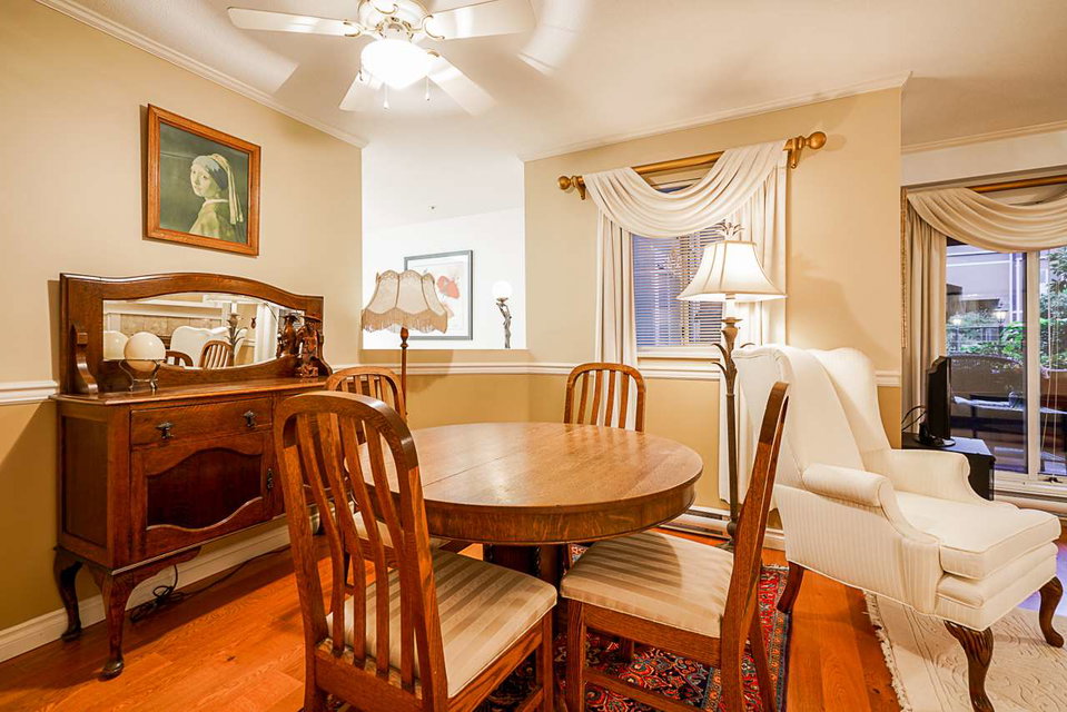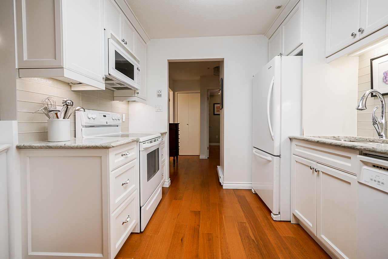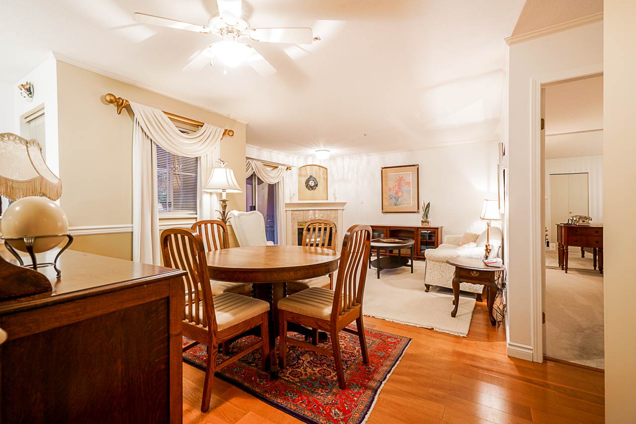 Elegant 2 bedroom, 2 bathroom, renovated corner suite on ground level with complete privacy & original owner. Bonus is exterior townhouse entry right beside elevator to parking. Enter into foyer w/newer bright kitchen w/granite countertops, glass backsplash, undermount lighting & eating area. Open style floorpan w/formal diningrm & spacious living room w/gas f/p & sliders out to large & private South garden patio w/gate to Riverfront & amazing views to infinity lagoon out to Fraser River. Upgraded H/W floors, crown moldings, 1 yr washer/dryer & new lighting thru out. Spacious masterbdrm w/walk thru closet to 4pce ensuite. Separate 2nd bedrm w/ 3pce updated bathrm. 1 parking, locker, pets ok. Rialto rainscreened building, exterior painted & repiped. Central location in The Quay. SEE VIDEO !