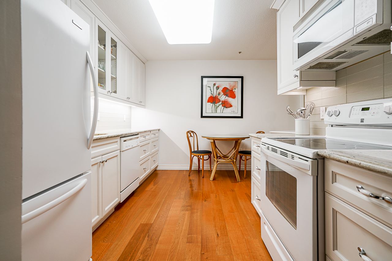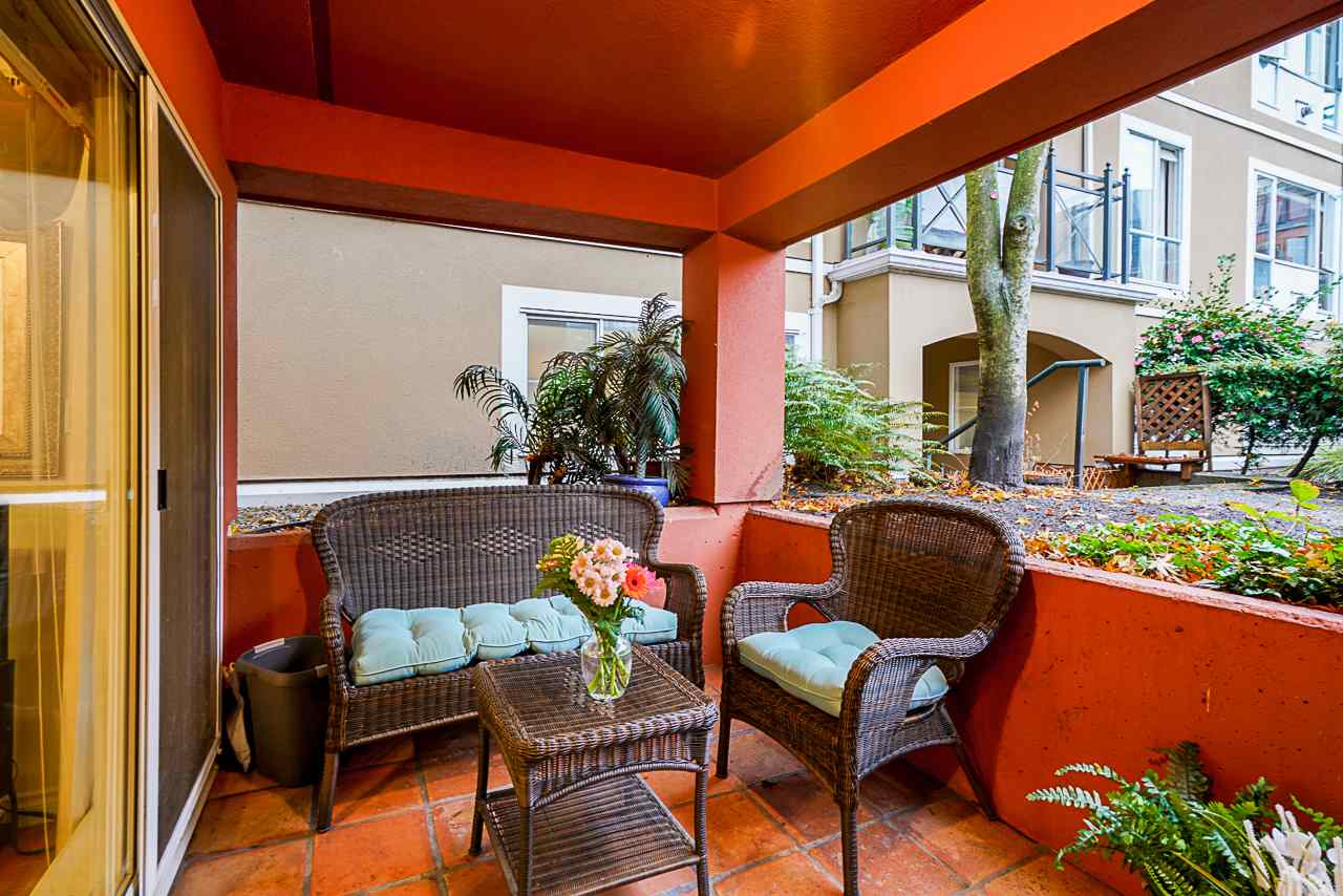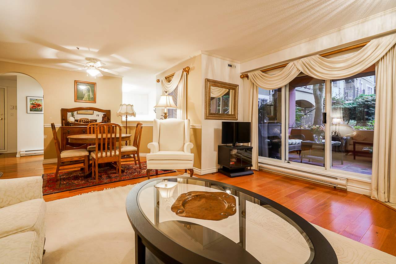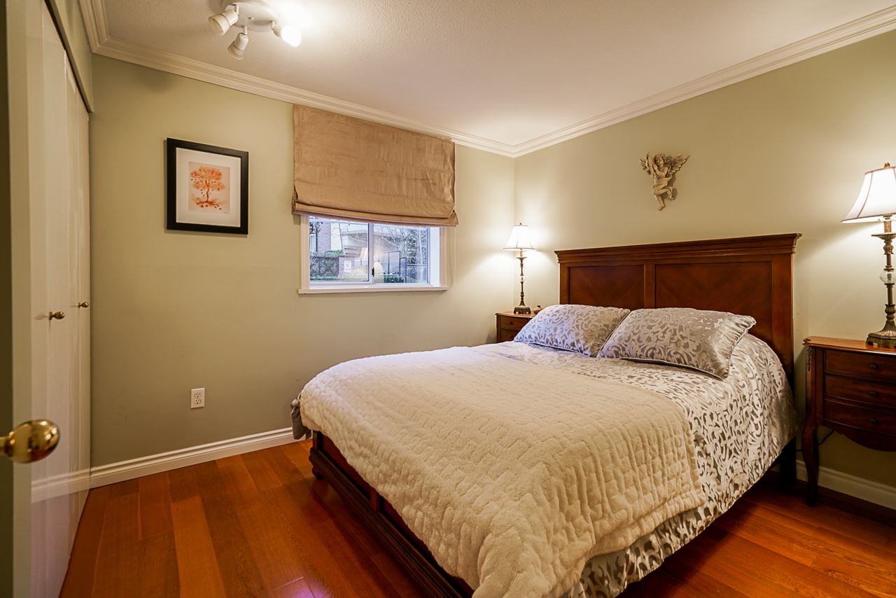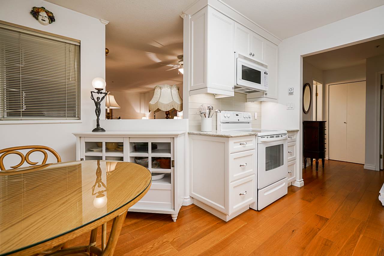 Elegant 2 bedroom, 2 bathroom, renovated corner suite on ground level with complete privacy & original owner. Bonus is exterior townhouse entry right beside elevator to parking. Enter into foyer w/newer bright kitchen w/granite countertops, glass backsplash, undermount lighting & eating area. Open style floorpan w/formal diningrm & spacious living room w/gas f/p & sliders out to large & private South garden patio w/gate to Riverfront & amazing views to infinity lagoon out to Fraser River. Upgraded H/W floors, crown moldings, 1 yr washer/dryer & new lighting thru out. Spacious masterbdrm w/walk thru closet to 4pce ensuite. Separate 2nd bedrm w/ 3pce updated bathrm. 1 parking, locker, pets ok. Rialto rainscreened building, exterior painted & repiped. Central location in The Quay. SEE VIDEO !