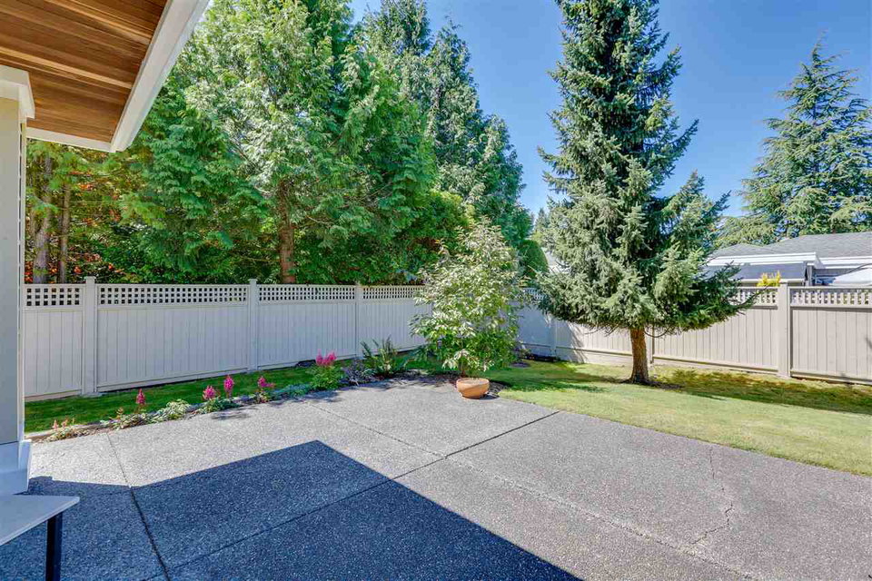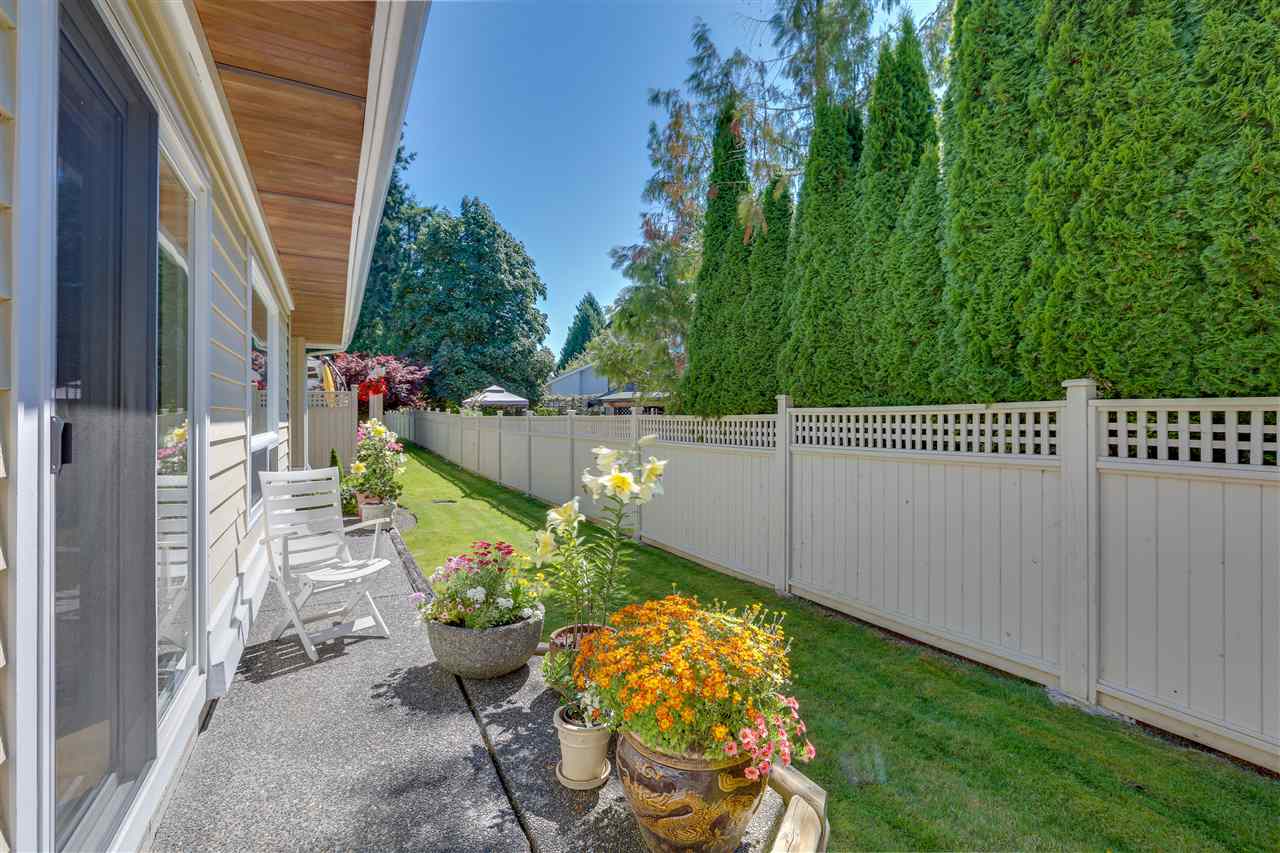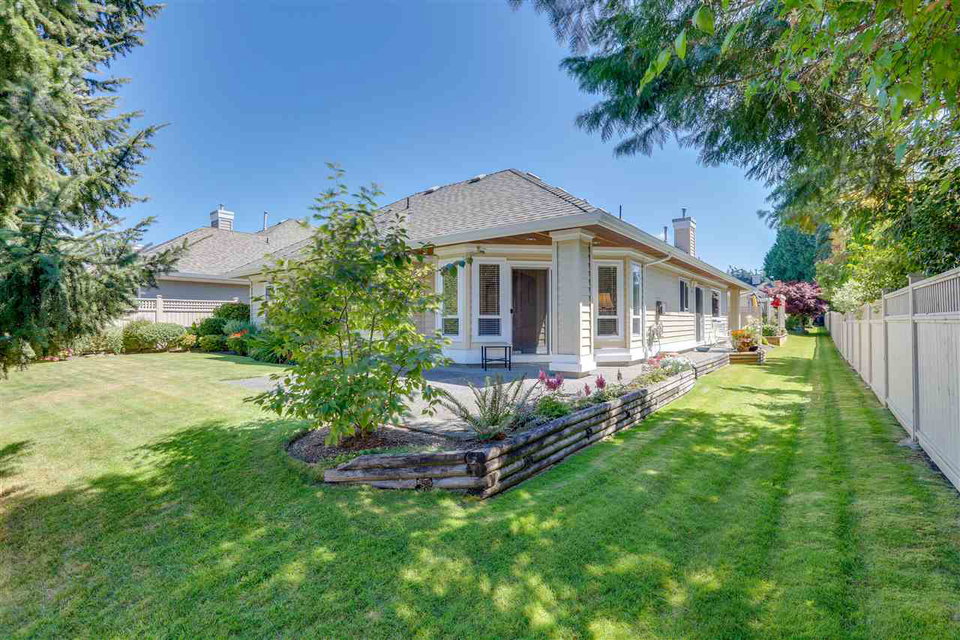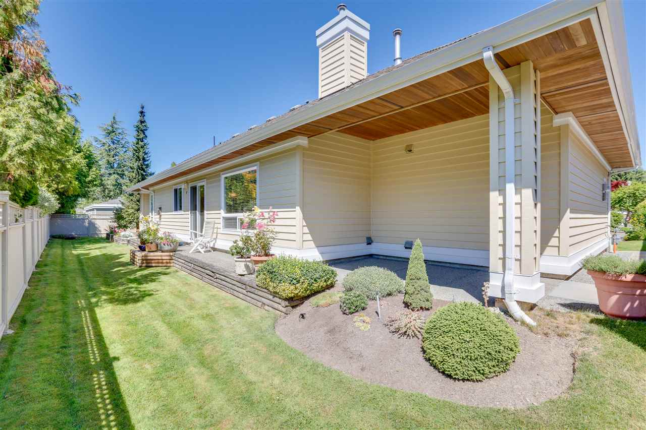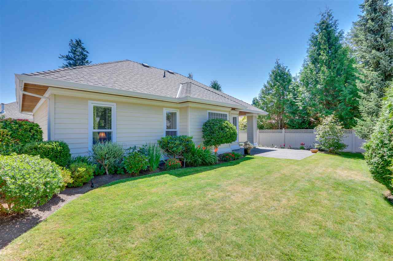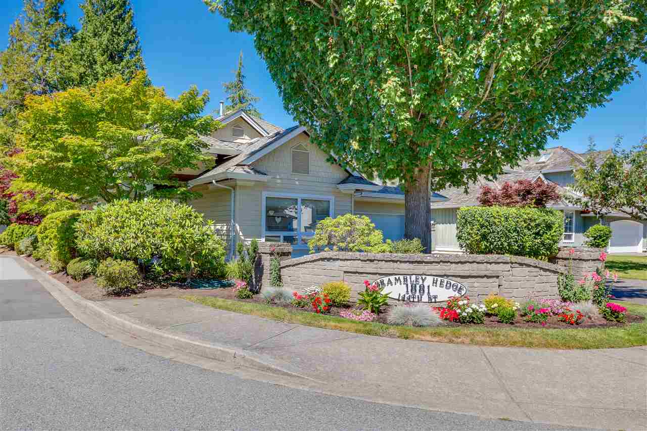 Deluxe DETACHED RANCHER townhome in sought after Brambley Hedge! This 2 bedroom home is located in the desirable southwest corner of the complex where 588 sq ft of outdoor patio space and gardens in the large and private yard soak up the sun. The impeccably maintained interior features oak hardwood flooring, formal dining and living rooms, 9ft ceilings & vaulted 10.5 ft living room ceiling, 2 gas fireplaces, large master bedroom with 4 pc ensuite. You’ll find ample cupboard & counter space, a pantry and upgraded appliances in the open concept kitchen. Newer roof and hot water tank. Double garage with additional parking. A short walk to Sunnyside Acres Urban Forest and Softball City. Centrally located near Semiahmoo Shopping Ctr, South Surrey Rec & Arts Ctr, parks and White Rock beach!