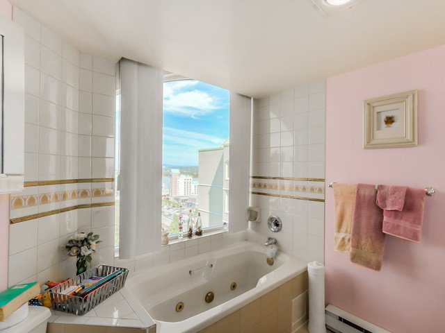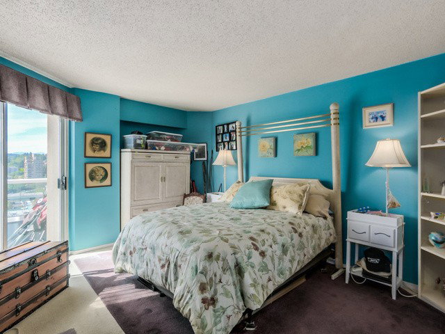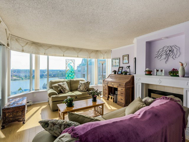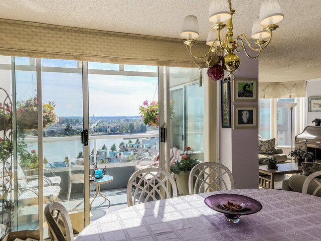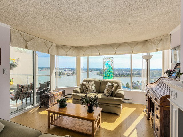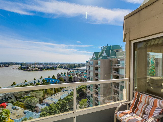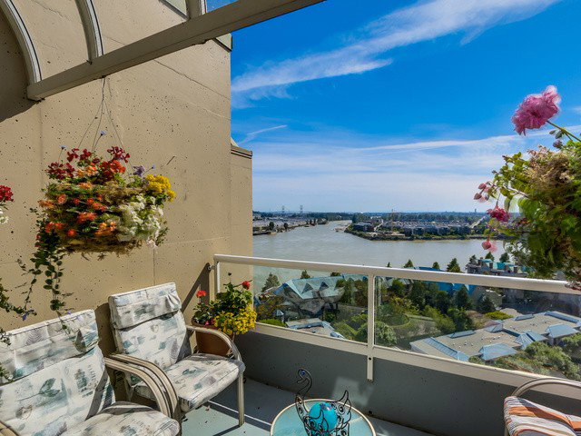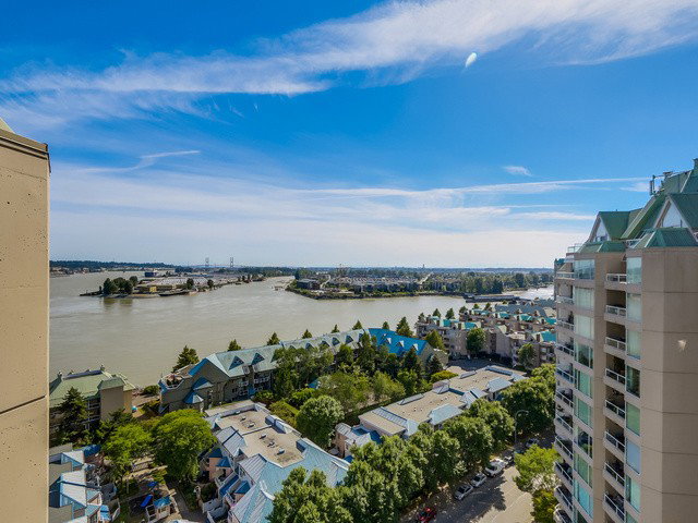 SUB PENTHOUSE @ QUAYSIDE TOWER I by Bosa! No unit above! This 1265 sq.ft 2 bedroom + den (or 3rd bedroom) has huge RIVER VIEWS – 2 balconies with access from 3 S/D’s off Diningroom/Livingroom + bedroom! Enjoy 2 full bathrooms (jetted tub in ensuite bath), gas fireplace, indoor pool, sauna, exercise room, hot tub, party room & secured entry & U/G parking + guest prkg. Steps to the popular RIVER MARKET, Boardwalk, Sktrain, Douglas College & shopping district. Well run strata! New elevators. Sorry – no pets & only 5 rentals.