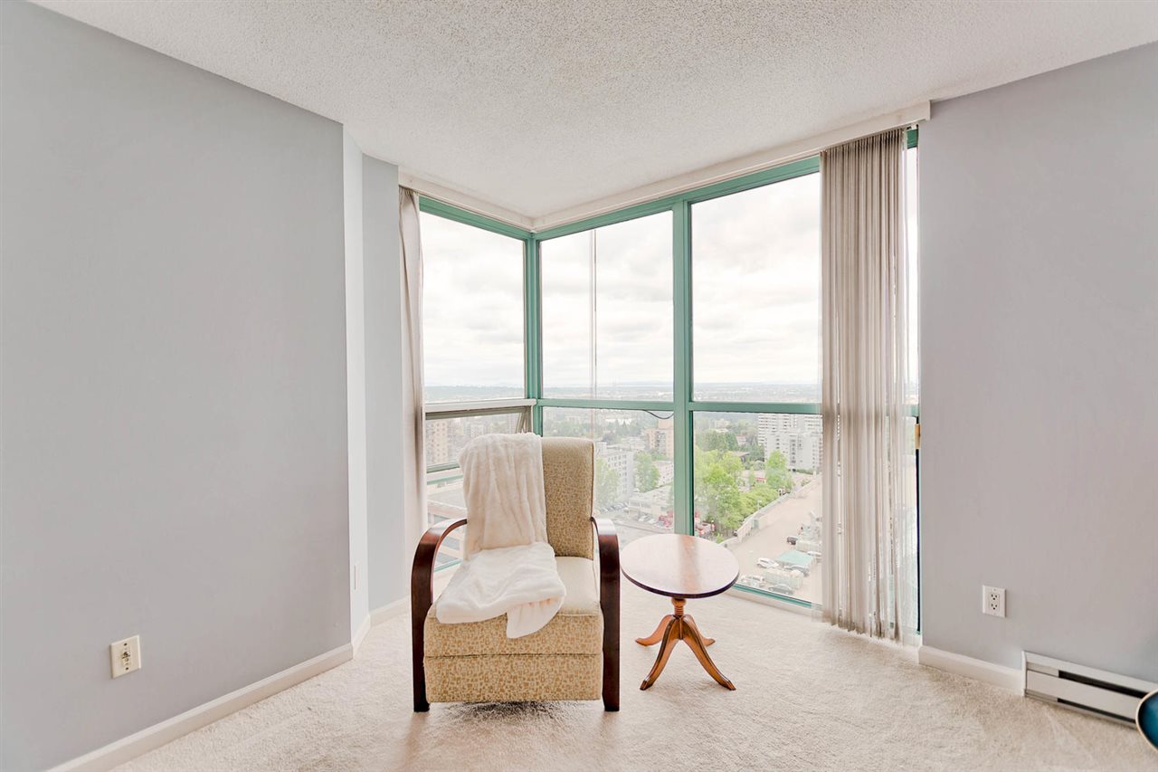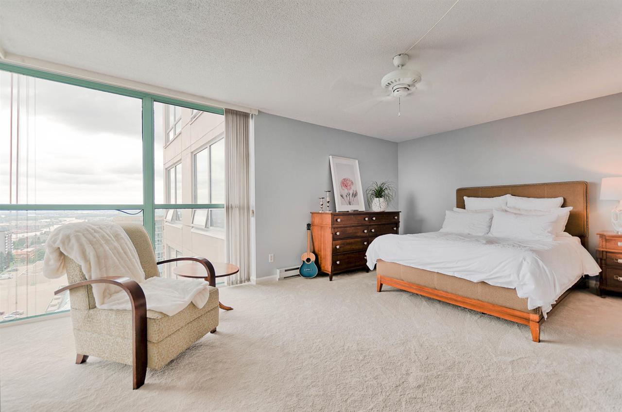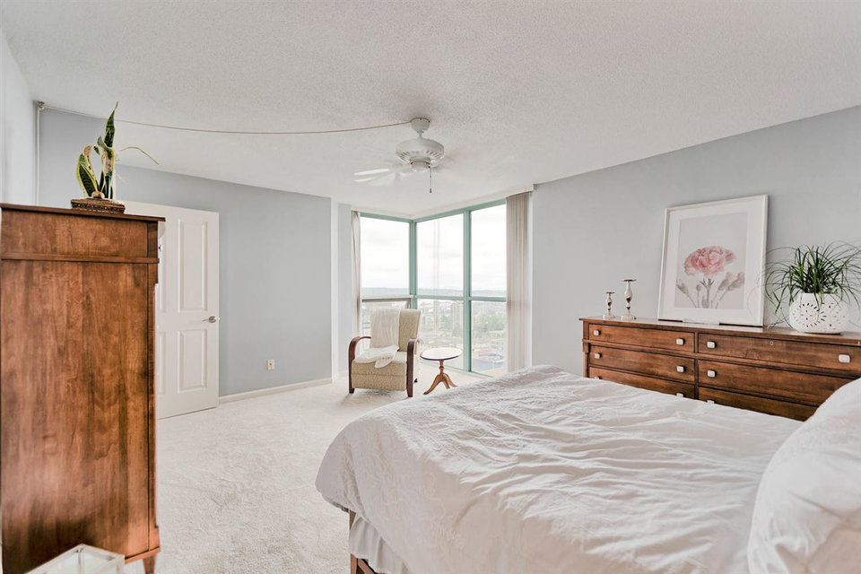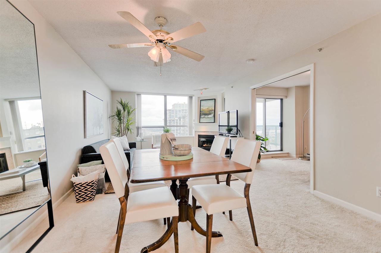 Once in a BLUE MOON, this BEST floor plan in one of the most SOUGHT AFTER buildings around will come to the market and this just happens to be one of the times! PHENOMENAL two bedroom and den with a MASSIVE deck high in the sky and the most GORGEOUS, PANORAMIC, BREATH TAKING views is now available! Brand new carpet and paint, gas fireplace, two full bathrooms, two parking spots, HUGE master bedroom, open concept layout with no wasted space and unparalleled convenience are just a few of the things to mention! Built by Bosa and attached to Royal City Mall for all your needs! No rentals allowed but one dog (up to 12 kg) or cat is! Don’t miss your chance to own this RARITY!