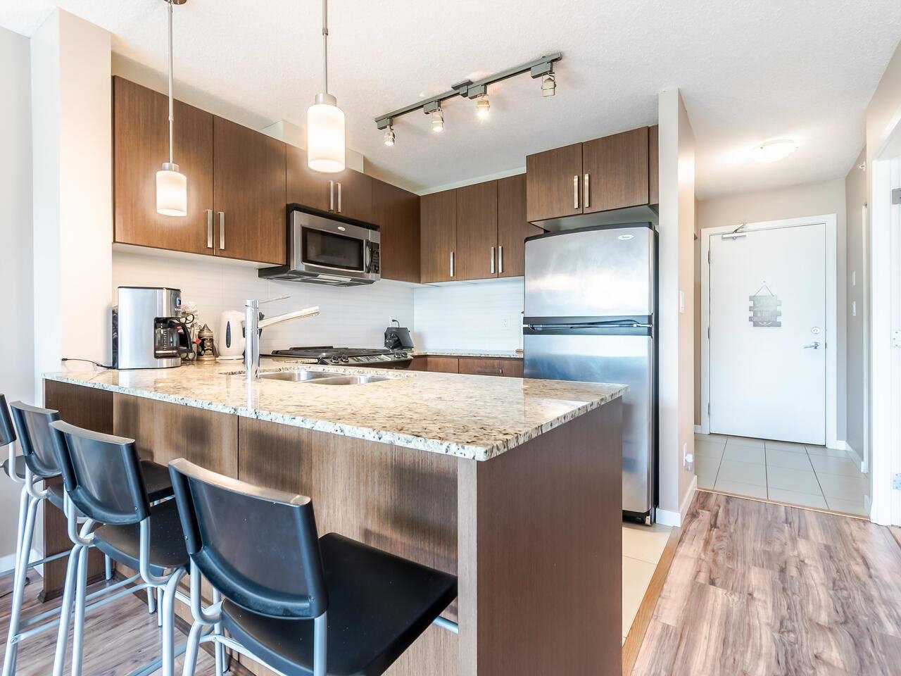 For SMART investors, First Time Buyers or people starting a new chapter in life! AWESOME one bedroom and den layout in a PHENOMENAL complex! GORGEOUS newer laminate floors, gas stove, electric fireplace, open concept den and a cheater ensuite are just a few things to mention! Good sized balcony to RELAX on! Located right next to Lougheed Mall with Skytrain and everything you could need just steps away and even minutes to SFU! One cat allowed, no dogs and open rentals 6 month minimum! Was just rented for $1,650 a month but would be much higher now!
