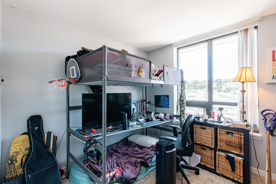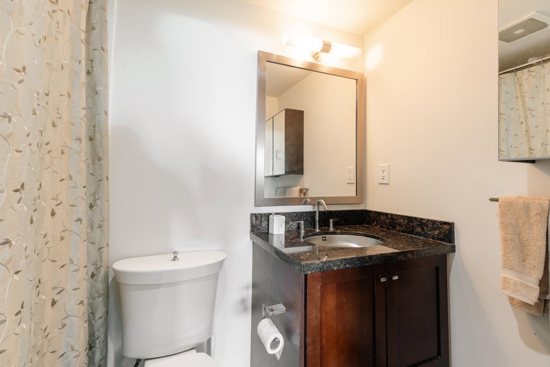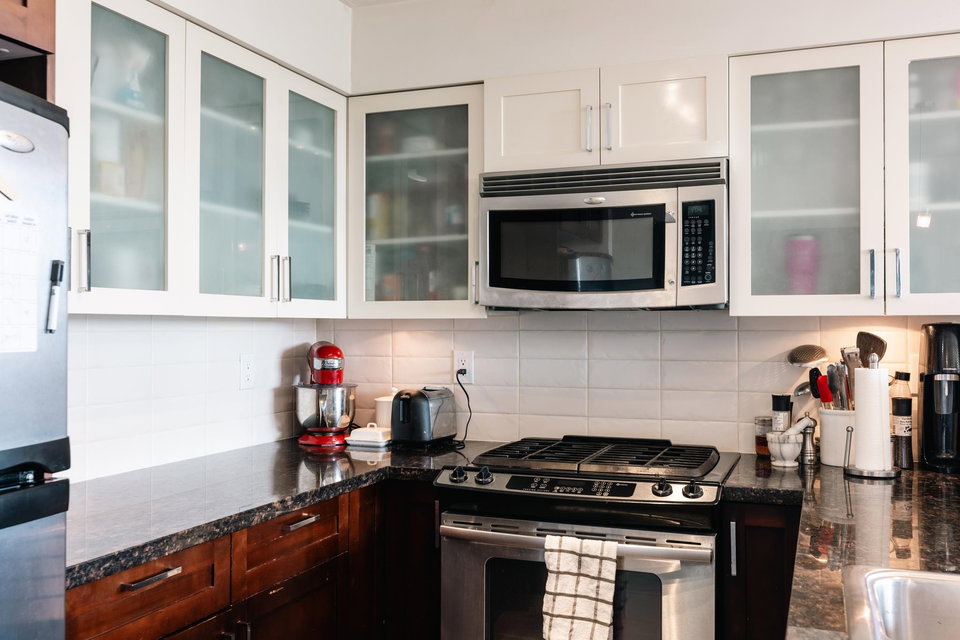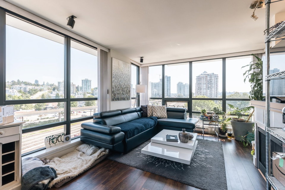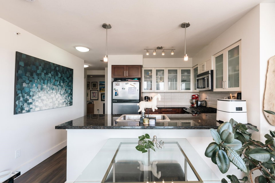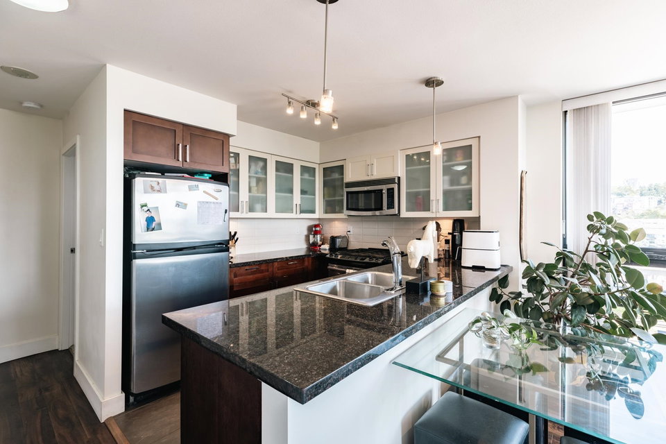 The Q by Aragon on the water in New West Quay! Fantastic open concept layout – 2 bed 2 bath 950 sf Corner Unit with city & Fraser river views! Kitchen features granite counters, stainless steel appliances with gas range & lots of storage. Good sized living & dining rooms with wide plank laminate floors & tons of windows/natural light. Bedrooms on opposite side of the unit including beautiful primary with walk through closet & 4 pcs ensuite. Super desirable location on the boardwalk, short walk to downtown New West, pier park, skytrain, restaurants, cafes, shopping. Building has a great gym! 1 parking & storage included.