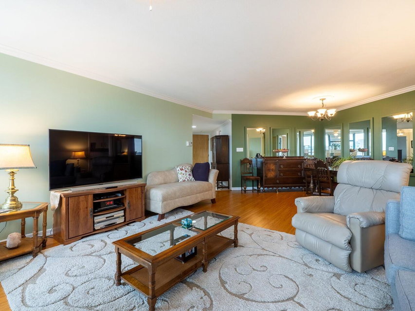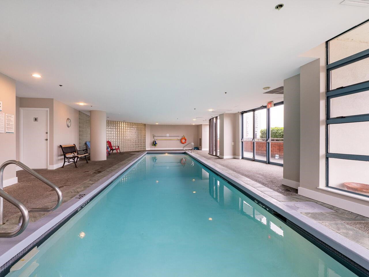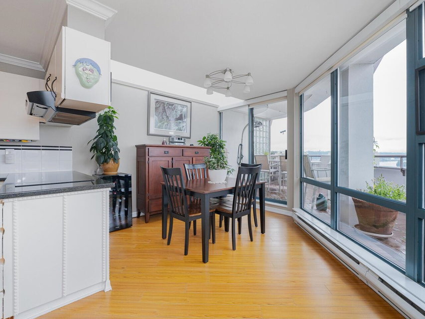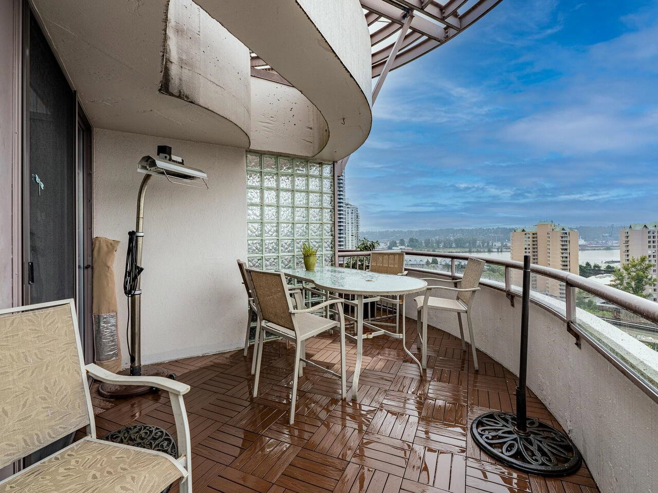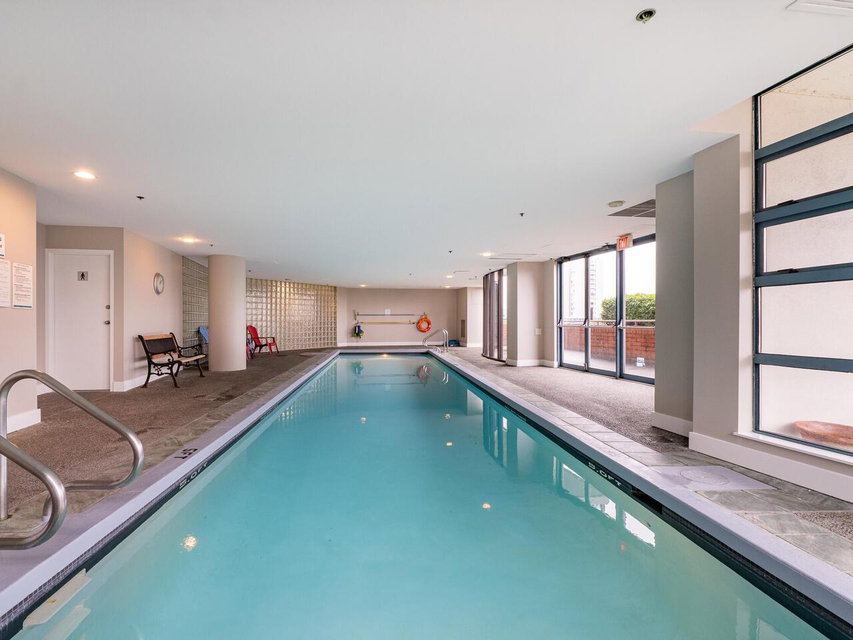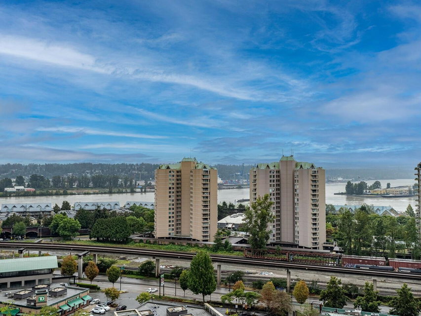 Penthouse living awaits you in the heart of downtown New West at Plaza Pointe. This incredible 1606 sq.ft. home boasts expansive Fraser River views. A large tiled foyer leads to the living room with a gas fireplace & dining room before entering the bright eat-in kitchen with black granite countertops surrounding stainless steel & black appliances & a skylight overhead. Sliding doors from both the kitchen & living room lead to the 439 sq.ft. balcony with edge to edge, composite wood tiles. French doors off the foyer open up to a beautiful home office & option for a third bedroom. The end of the hallway opens up to a huge primary bedroom suite with twin mirrored closets, & a five piece ensuite with a separate glass, enclosed shower next to the soaker tub & skylight above. Downstairs a 50′ lap pool is surrounded by windows & next to the well appointed fitness facility, showers & change rooms plus an amenity room lounge with a bar & full-size billiard table. 2 cats/dogs allowed. 3D virtual tour at Realtor’s site.